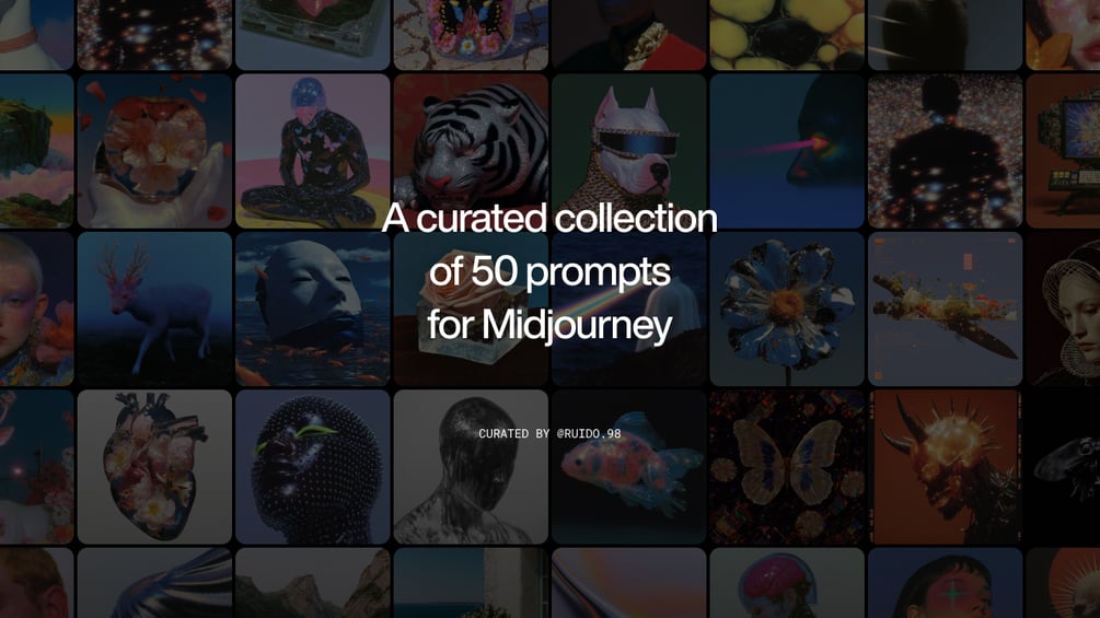 Una colección curada de 50 prompts gratuitos para MidJourney — diseñados para inspirar creatividad y generar visuales estéticos, potentes y distintivos.